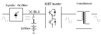 早期大中型UPS主回路結(jié)構(gòu)采用可控硅整流將輸入的交流電整為直流,電池直接掛在直流母線上,當(dāng)輸入市電正常時,靠整流可控硅的調(diào)節(jié)對電池充電,同時為GTR或IGBT結(jié)構(gòu)的橋式逆變器供電,逆變器將直流逆變?yōu)榻涣鳎詈蠼?jīng)過輸出變壓器的升壓及濾波,提供純正的交流輸出。從其結(jié)構(gòu)中可以看出,從整流(從交流變?yōu)橹绷鳎┑侥孀儯ㄔ趶闹绷髯優(yōu)榻涣鳎┑倪^程中,每個環(huán)節(jié)都是將壓環(huán)節(jié):可控硅整流是為了提供恒定的直流電壓而采取的一種整流方式(可通過可控整流的導(dǎo)通角調(diào)整來適應(yīng)輸入電壓變化,確保輸入交流電壓變化時整流輸出直流電壓的恒定),由于可控硅整流只能斬掉一部分輸入電,所以其恒定輸出電壓的代價是將輸出電壓恒定在底于全波整流輸出電壓的某個數(shù)值上。而逆變環(huán)節(jié)同樣是一個降壓環(huán)節(jié),從可控整流輸入來的直流電在通過逆變器逆變出交流的過程中同樣采用的是斬波的做法,其結(jié)果同樣是輸出電壓等級的再次降低。正是由于上述的原因,在此種結(jié)構(gòu)的UPS中,必須在輸出測加入升壓變壓器,將逆變輸出的較低恒定電壓升致合理的輸出范圍,最終提供了恒定的220/380V輸出。